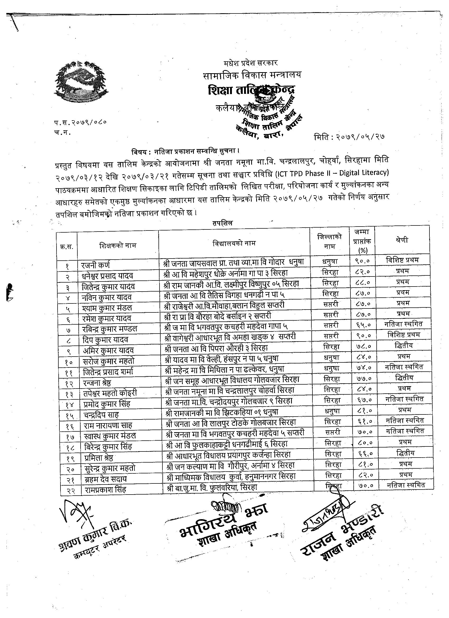 सूचना तथा सञ्चार प्रविधि (ICT TPD Phase II - Digital Literacy) पाठयक्रममा आधारित शिक्षण सिकाइका लागि टिपिडी तालिमको नतिजा ( तालिम सञ्चालन स्थान : श्री नमूना मा वि चोहर्वा, सिरहा)